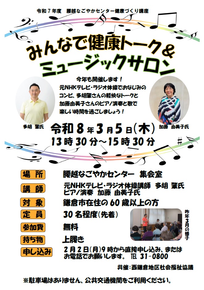 以下のイベントを致します。ご都合がつきましたら、ぜひご参加下さい。 加藤由美子 ■ 3月5日(木)、みんなで健康トーク&ミュージックサロン ![]() 詳細はこちら |